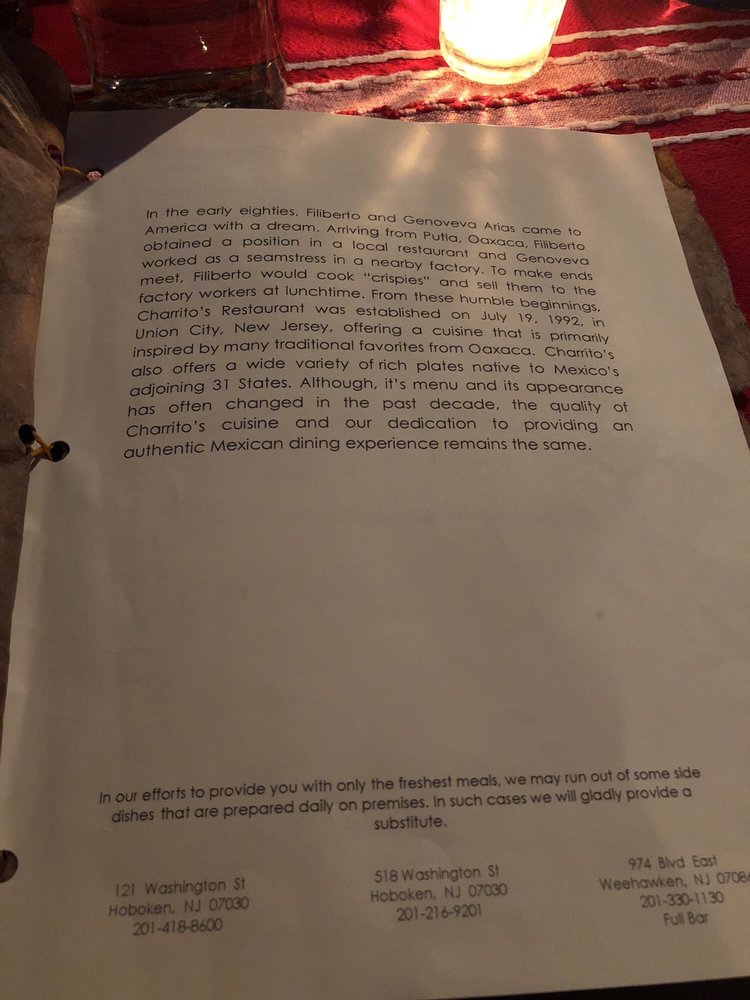 Charrito's Restaurant in Weehawken, NJ offers a vibrant Mexican dining experience with a diverse menu that caters to various dietary preferences. From traditional classics like Enchiladas and Quesadillas to unique dishes like the Tampiquea Arrachera steak, each item is bursting with authentic flavors. The Camarones a la Diabla and Enchiladas Oaxaqueas are must-tries for seafood and mole sauce enthusiasts. Customers rave about the freshly made guacamole and the wide selection of beverages, including the refreshing Jamaica Hibiscus flower tea and Horchata Rice water. The restaurant's scenic view of Manhattan adds to the overall ambiance. With friendly service and generous portions, Charrito's Restaurant promises a memorable dining experience for all.