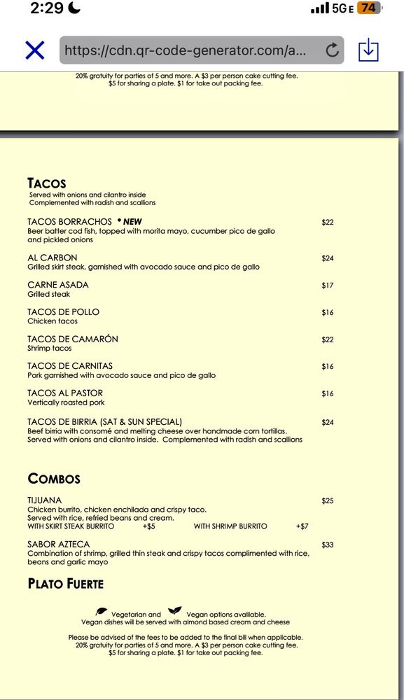 Pan fried plantain rolls stuffed with cheese. Tomato sauce, queso fresco, crema and pickled onions garlic. Chose almond based cream an cheese for a vegan option